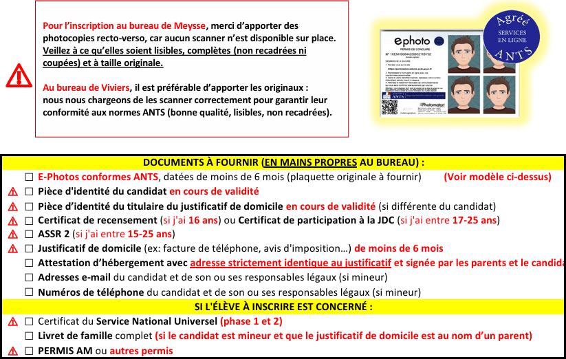 Si c’est pour une toute première inscription dans une auto-école, afin d’éviter des déplacements inutiles, n’oubliez pas de venir avec les documents suivants pour établir l’AIPC auprès des services de l’ANTS: